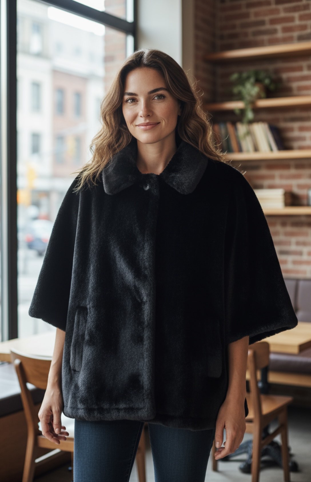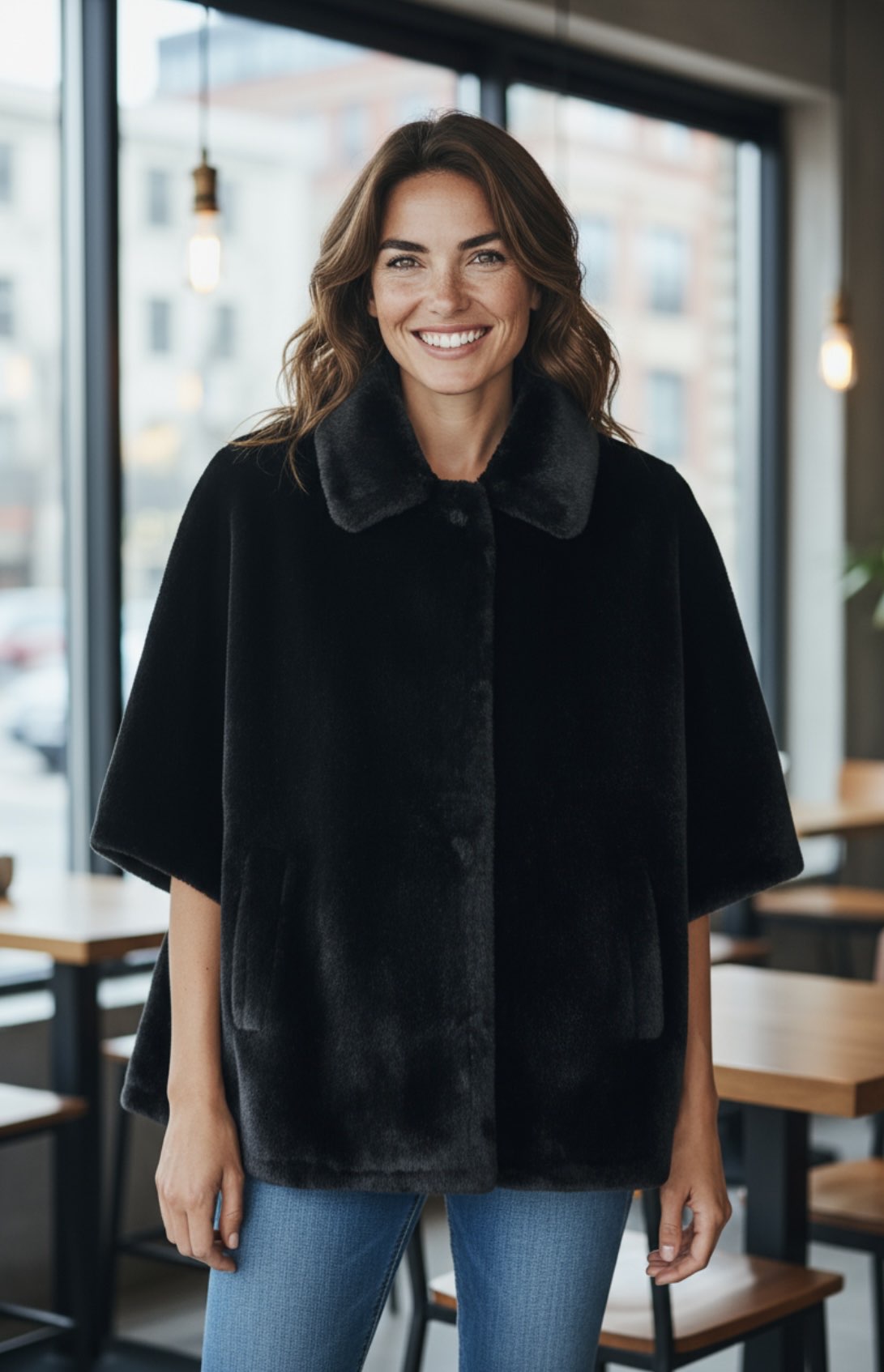 CAPPETTA IN ECOPELLICCIA CON MANICHE 3/4 E BOTTONI LATERALI DA APRIRE SE SI NECESSITA DI MANTELLA.