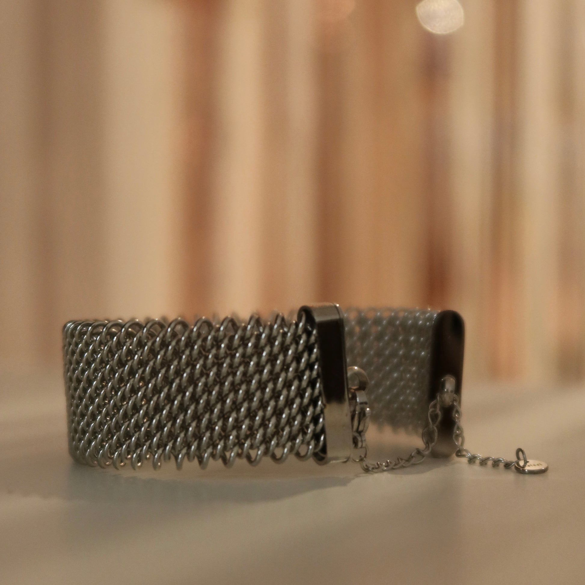 Bracciale rigido in acciaio regolabile effetto maglia con catenella di sicurezza posteriore