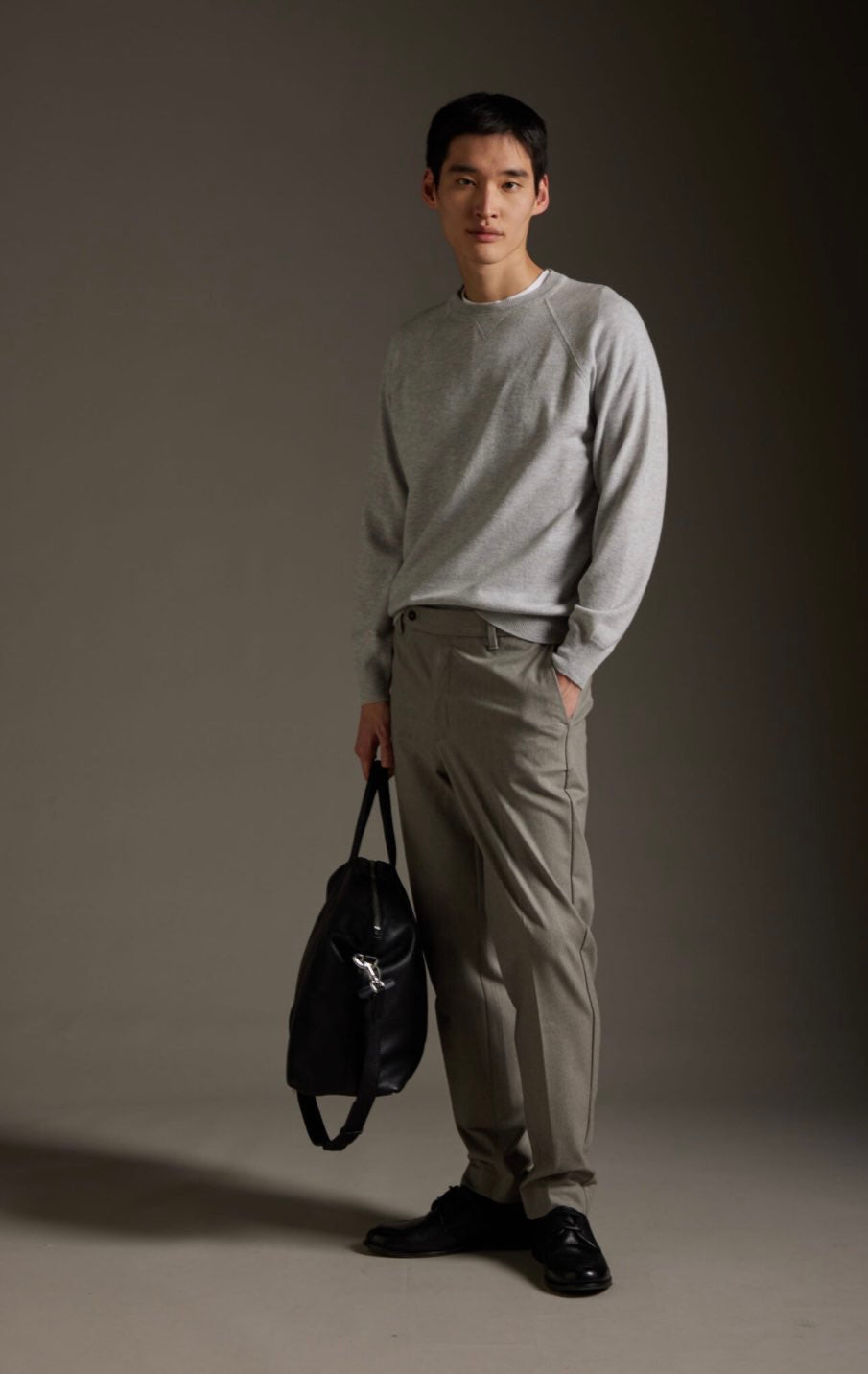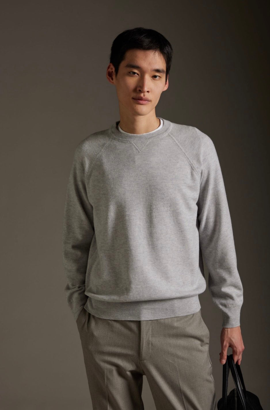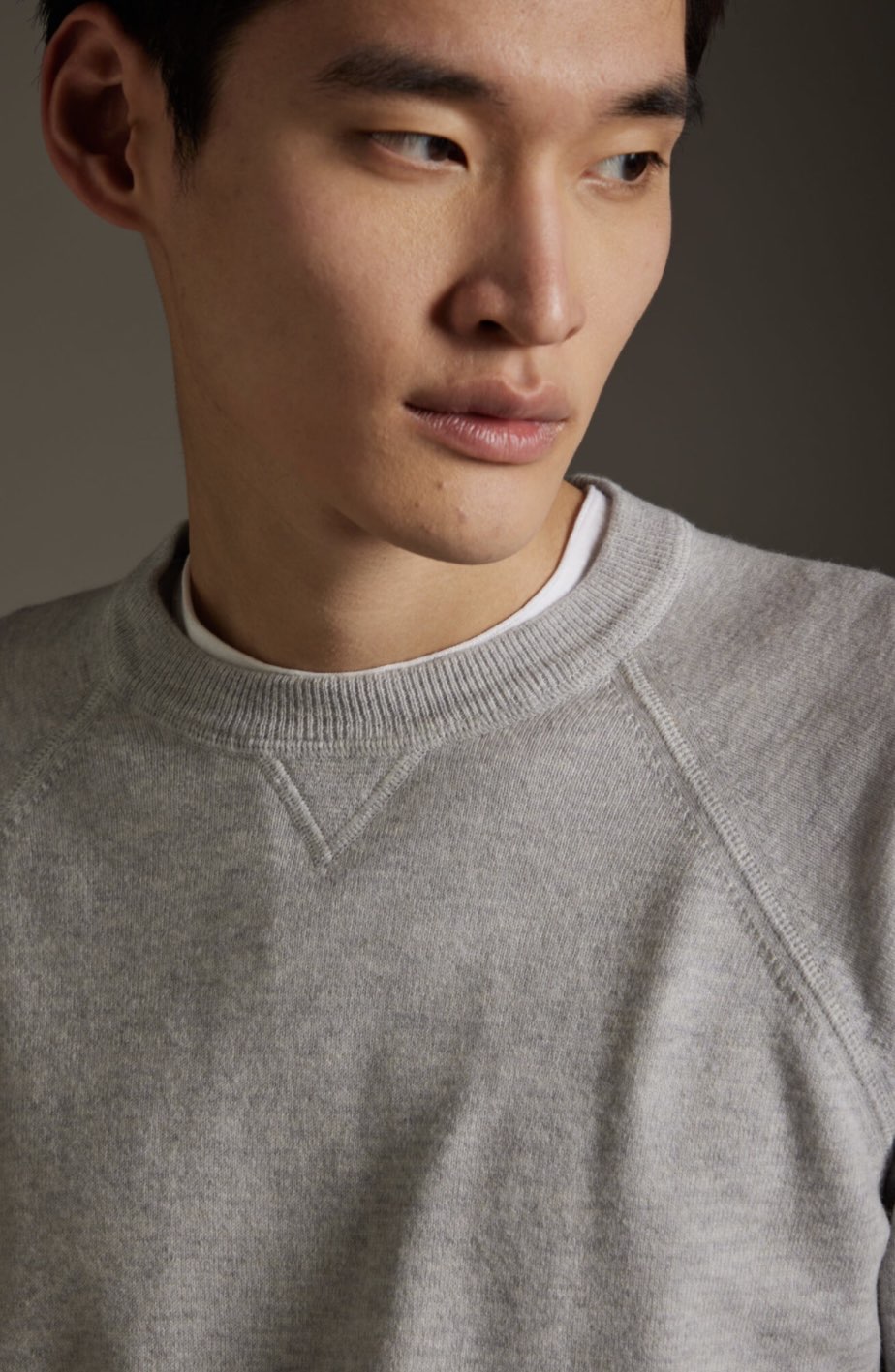 Girocollo taglio felpa rasato calato, con manica a raglan, triangolo e coprenti in tono, realizzata su finezza 14 in puro Lana Merino Extrafine cardata, vestibilità regolare, con fondo polsi e collo a costine
