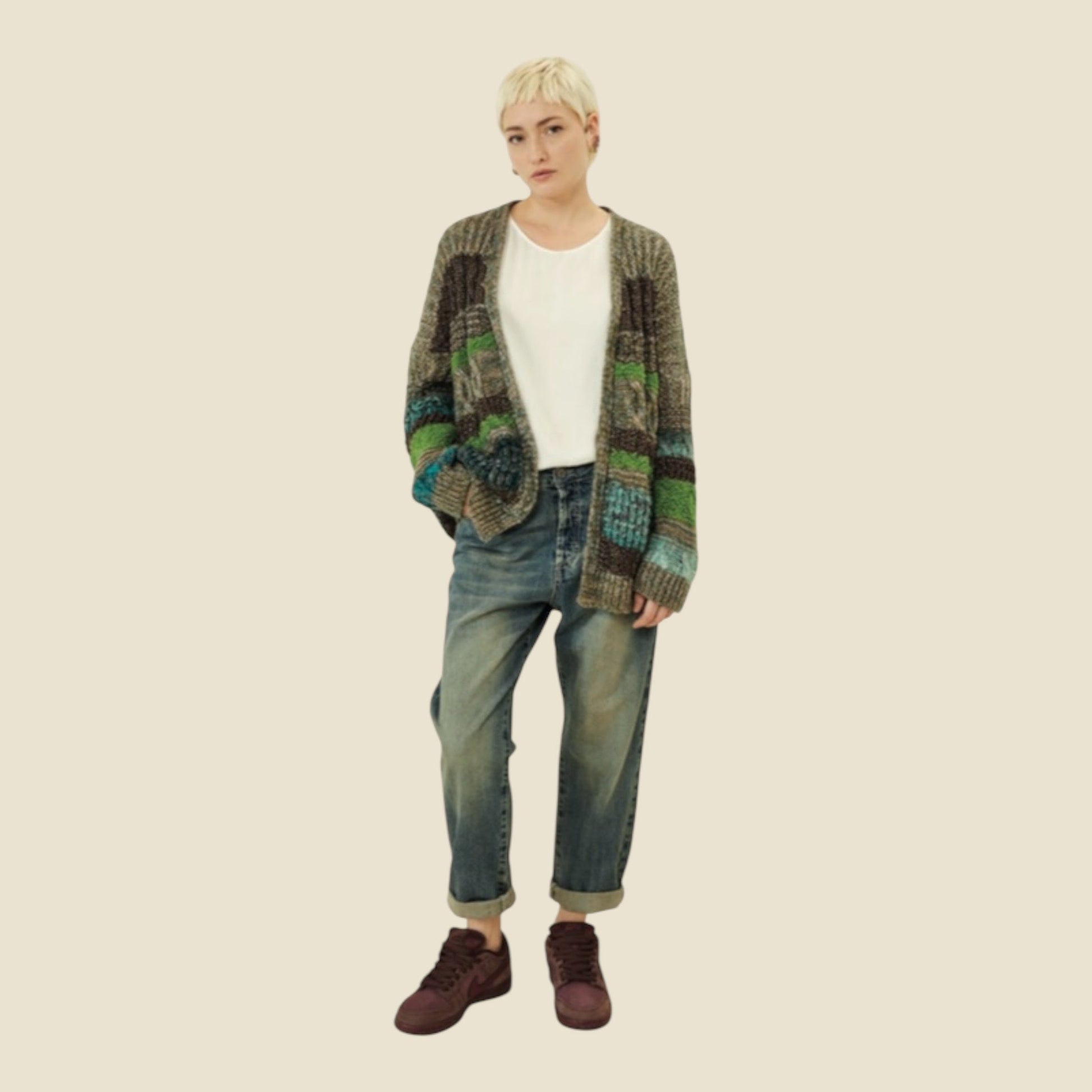 CARDICAN A RIGHE ORIZZONTALI DI VARI FILATI CON LUREX E PAILLETTES.